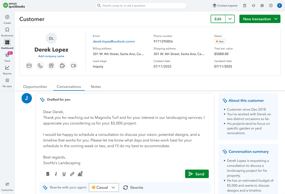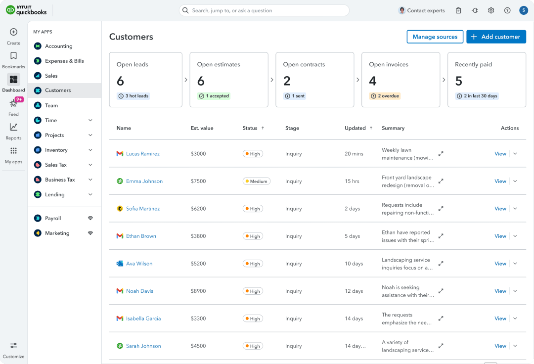 Intuit QuickBooks is a financial platform designed to simplify accounting and business management for millions of small businesses. Within the ecosystem, QuickBooks Customers is a built-in CRM and sales tool that lets SMB owners manage customer relationships, communicate, and send invoices.