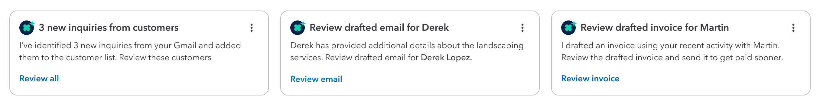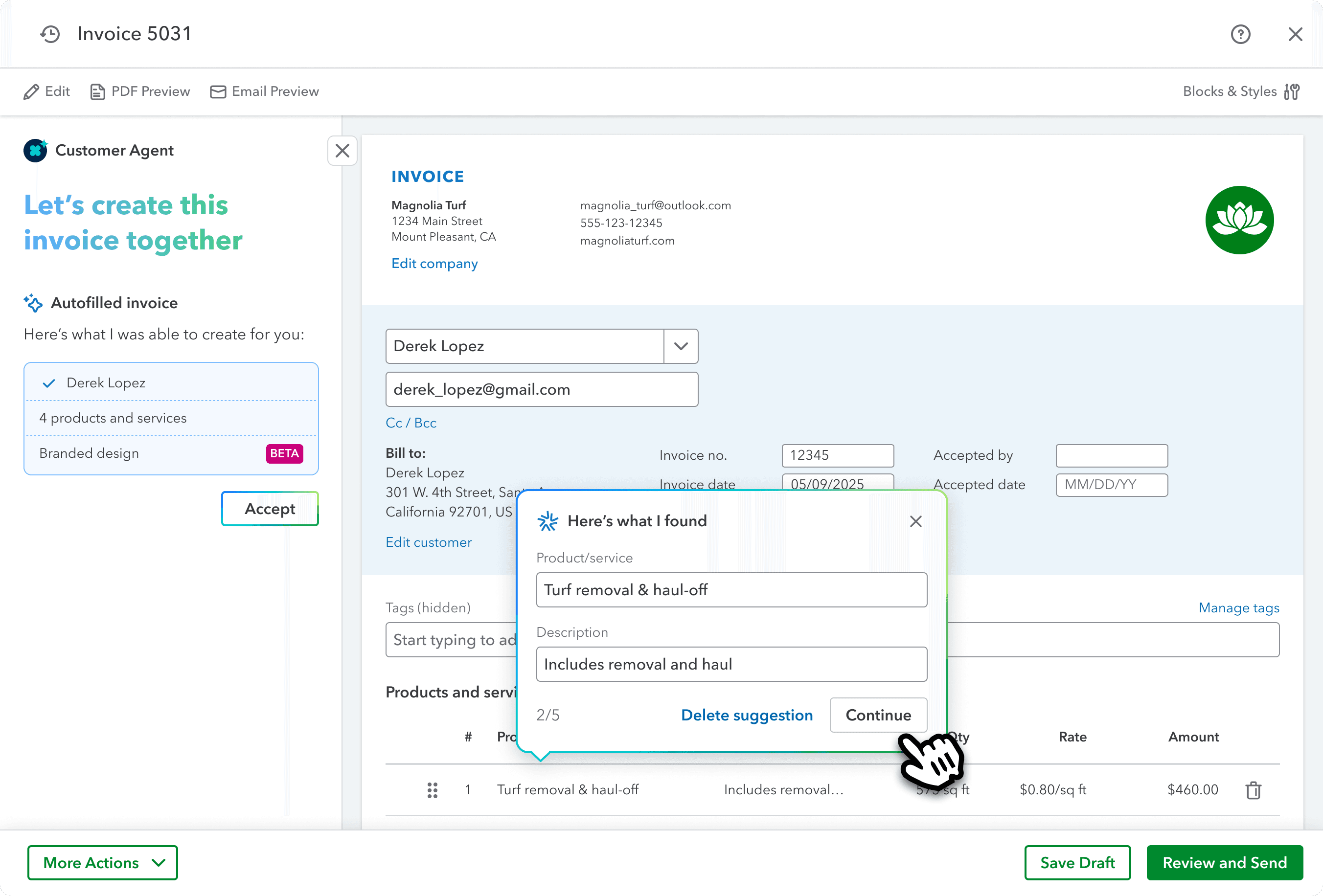 ased on past conversations, Customer Agent pre-fills invoices with the right products and services and has them ready for your review when it's time to send.