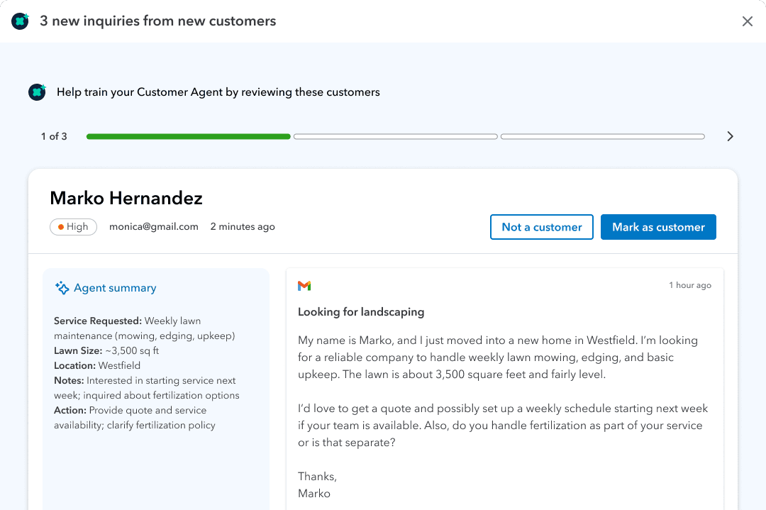 Customer Agent suggests next steps based on past conversations and automates key parts of the sales workflow, while preserving customer control for decision making.